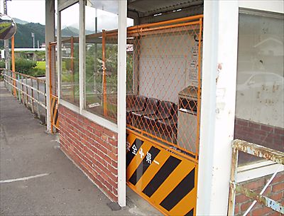 待合室は手付かず。これまた柵が。 盗難を恐れての処置?でも、持ち出そうとしたら 簡単に出来るけど。