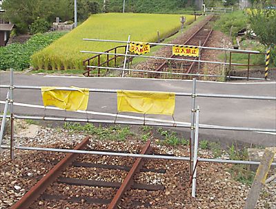 反対側に目をやると柵が。 工事用の柵ですね。簡単に入れるのであまり意味ないかも。 踏み切りは、レール撤去して舗装をやり変えてる。