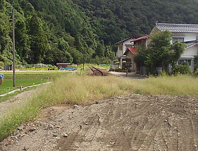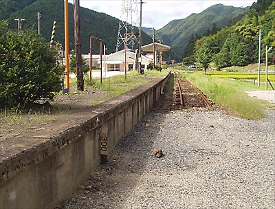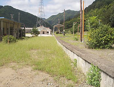 使用していたのは1線のみのようです。 片側のみに行き先表示の看板が残ってました。 左の建物が公民館。 土床の一部に土が・・・。 奥は手付かずのままです。