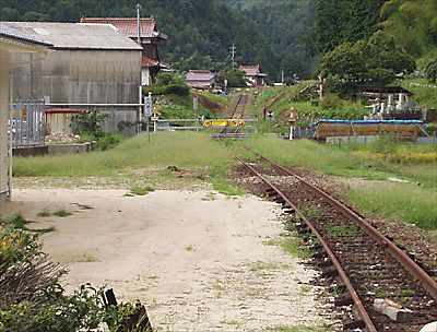 島式ホームですが、ずいぶん前から1線のみの使用だったみたいです。 奥の建物は、最近建てられたと思われる公民館。