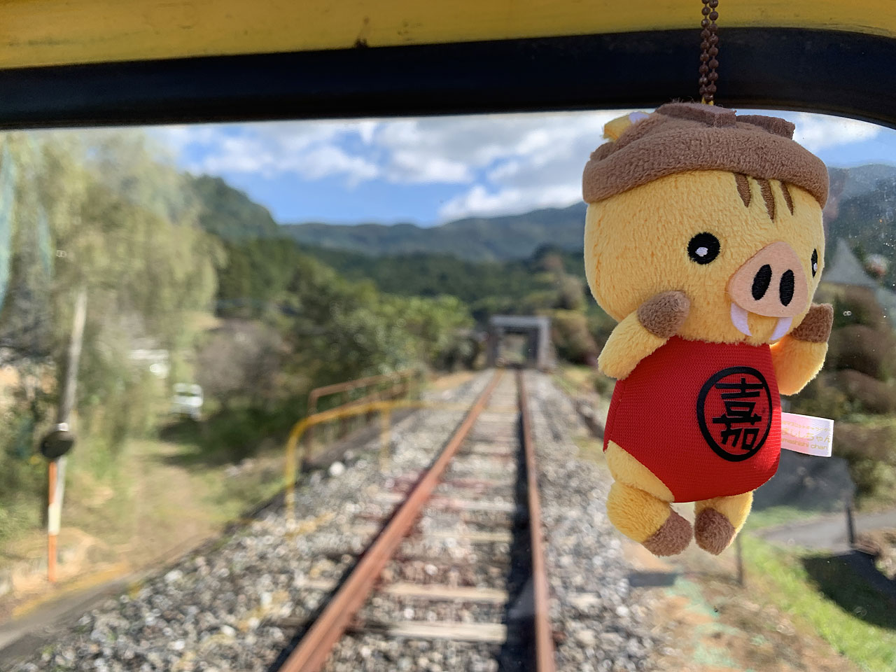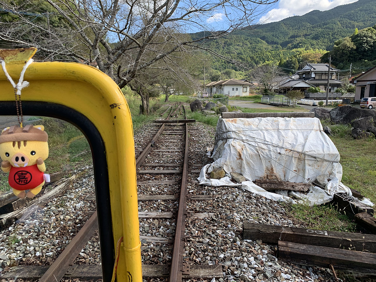 上山田側で折り返して、のりばを通過して熊ヶ畑駅跡側の折り返し地点に到着。再びバックして戻ります。