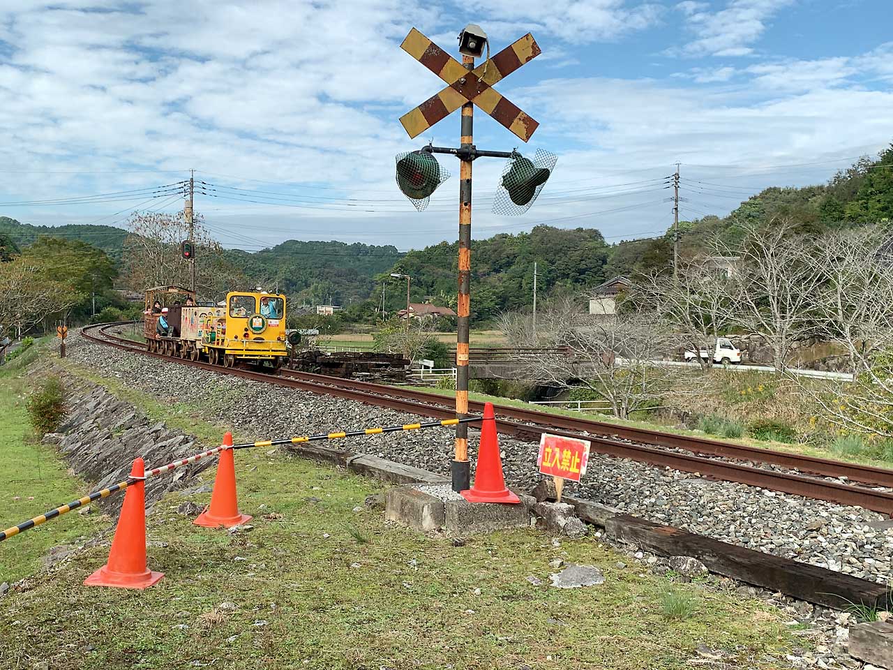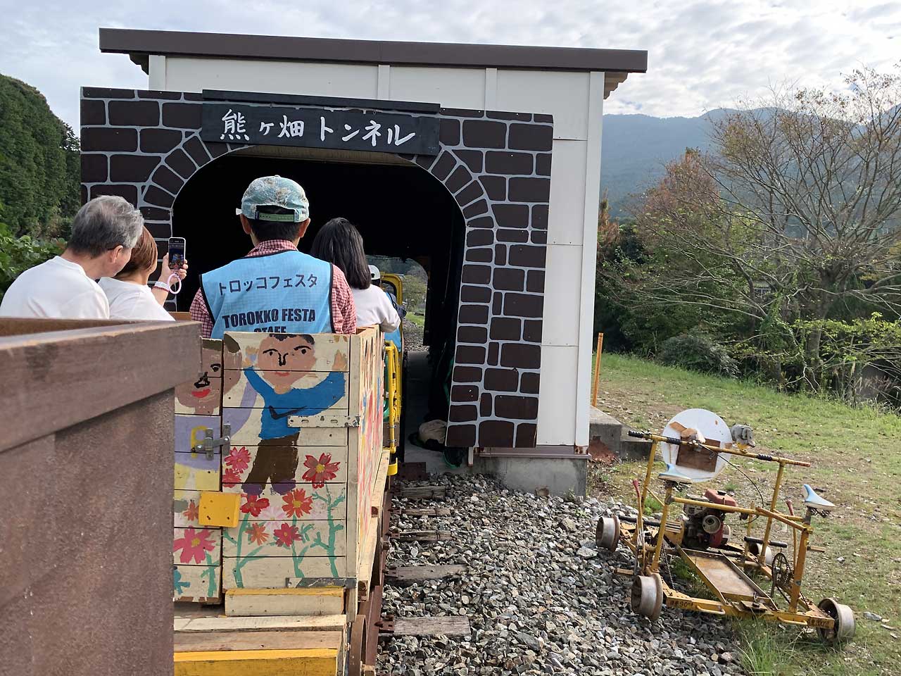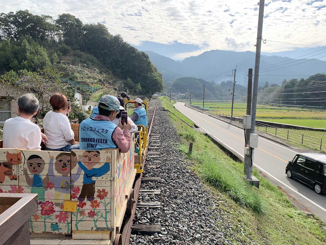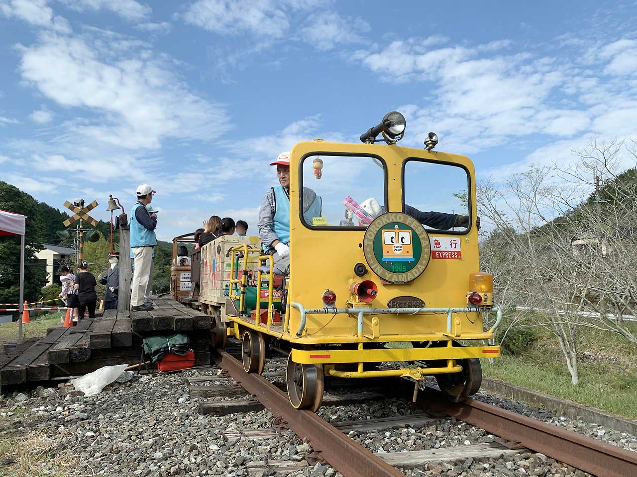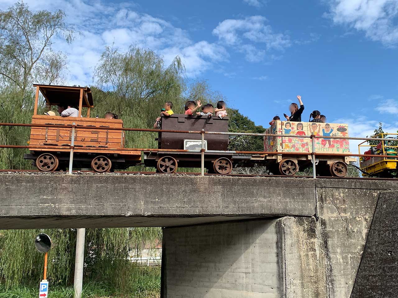 久しぶりに近畿大学謹製トロッコに乗車。少し狭いけどね。いつもは牽引車の隣に連結された子供の絵画トロッコに乗るんです。少し広いので^^;