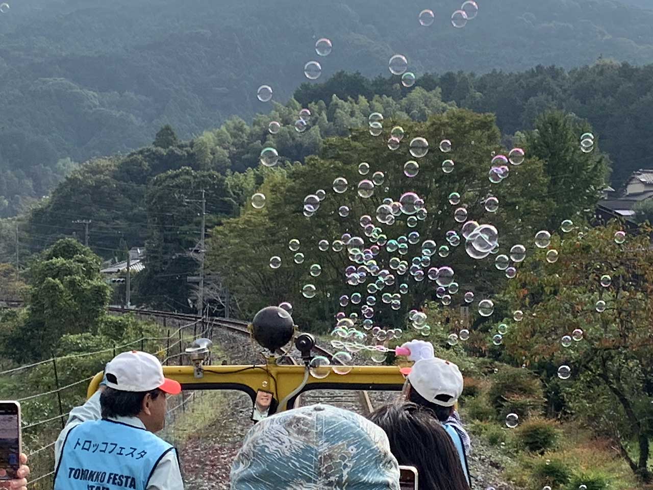 牽引車のスタッフが何かを頭上に上げたと思ったら……なんとシャボン玉飛ばし!結構大量(笑)子供たち喜びますばい!